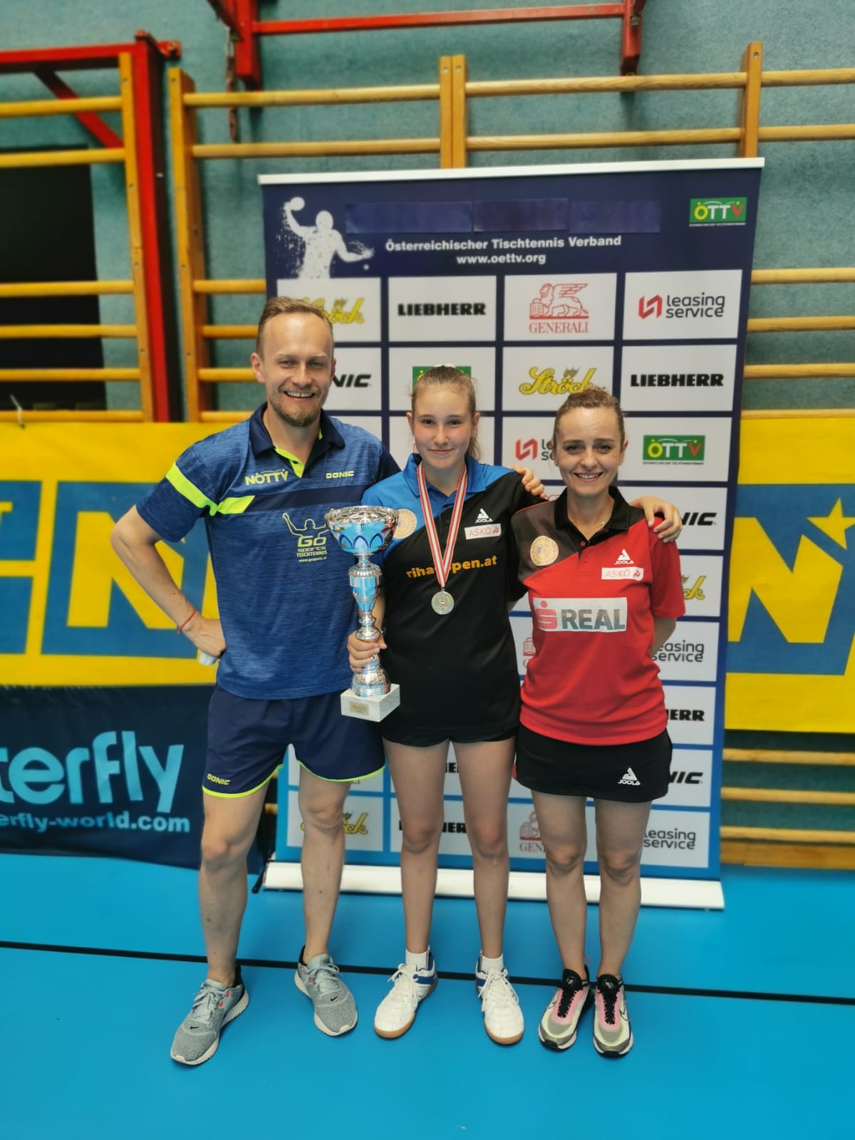 Glückliche Gesichter: die österreichische Meisterin mit ihren Trainern. Wir freuen uns auch!